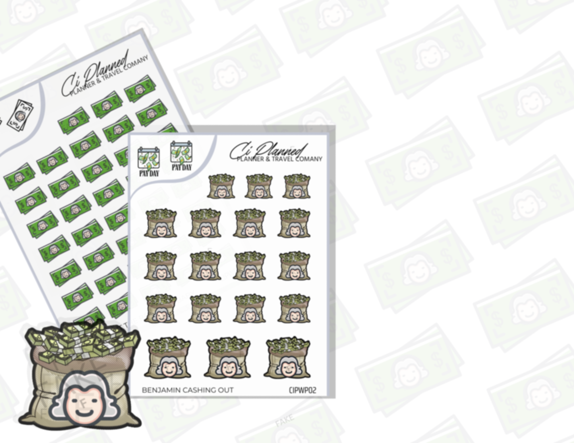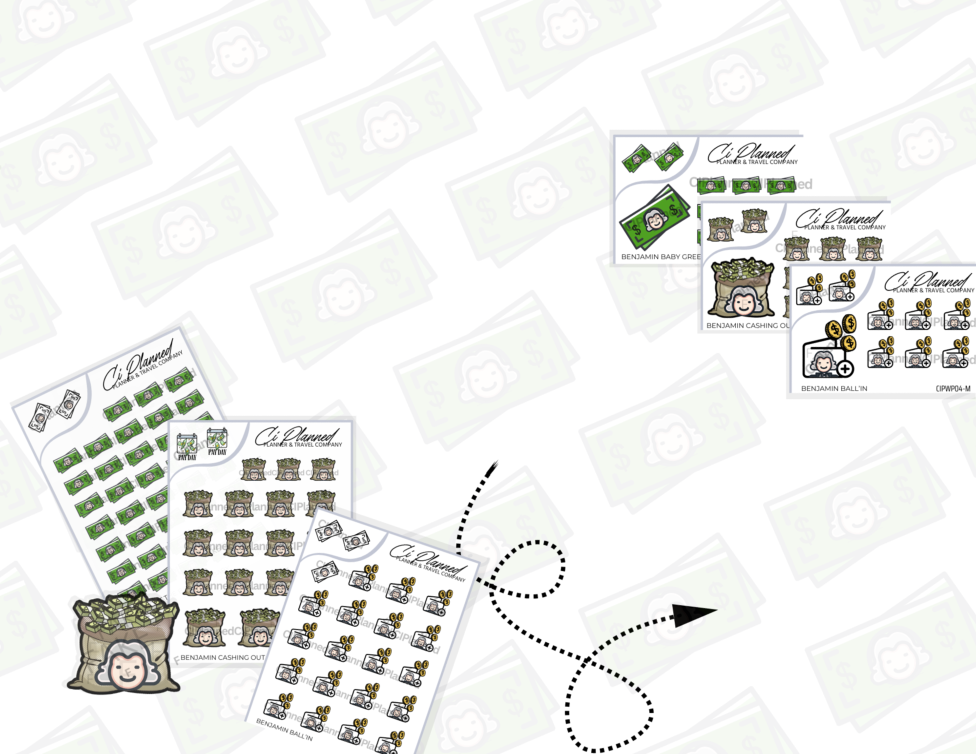 THE BENJAMIN COLLECTION | Stationary Stickers, used for planners, journals and notebooks. The Benjamin Collection represent money. Available in 3 different designs and 2 different sizes. 3 Full Sticker Sheets and 3 Mini Sticker Sheets. Benjamin Baby Green design, is a green money bill with a Benjamin Franklin doodle in the center with a dollar sign on each side. Benjamin Cashing Out design, a brownish green money bag with money peeking out of the top of the bag and a Benjamin Franklin doodle on the front and our Benjamin Ball’in design, has 3 gold coins flowing into an open white wallet with a Benjamin Franklin doodle on the front and a plus sign on the right corner of the wallet.